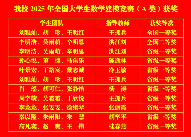 学校通过构建“以赛促学、以赛促教、以赛促练”体制,激励学生学习数学的积极性和主动性,提高学生建模和解决实际问题的创新意识和综合能力,进一步推动大学数学教学体系、教学内容和方法的改革。(撰稿:吴超云 审核:易明芳 闻军)