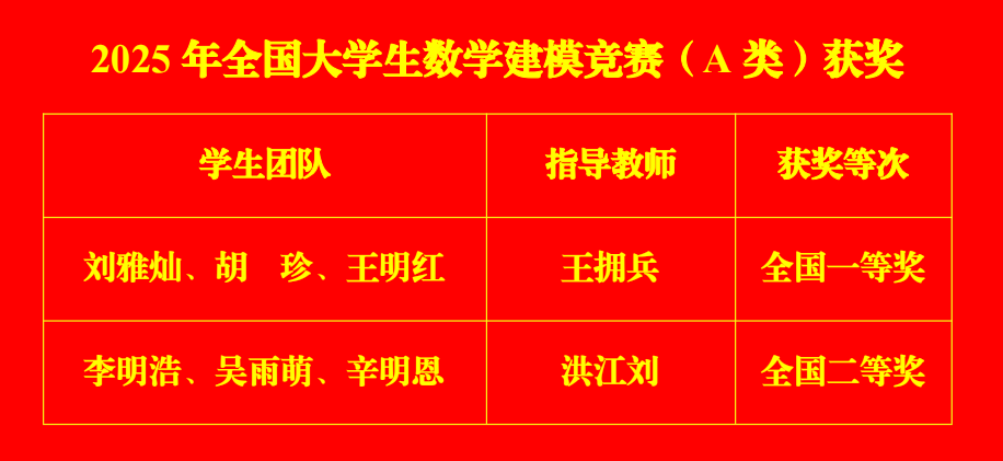 近日,由教育部高教司和中国工业与应用数学学会举办的全国大学生数学建模竞赛(A类)成绩揭晓。数理学院王拥兵老师指导的刘雅灿、胡珍、王明红团队荣获全国一等奖,洪江刘老师指导的李明浩、吴雨萌、辛明恩团队荣获全国二等奖。