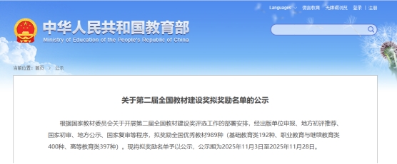 全国教材建设奖由国家教材委员会主办、教育部承办,是全国教材建设领域的最高奖。该奖项每四年评选一次,表彰在教材编写、出版、使用等环节中作出突出贡献的单位与个人,对引导教材建设方向、提升教材质量具有重要标杆意义。本届评选严格遵循“坚持正确导向、质量为先、公平公正”原则,从教材的政治方向、思想内涵、创新价值、编写质量、实践效果等多个维度进行全面考量,最终拟奖励全国优秀教材989种,其中,基础教育类192种、职业教育与继续教育类400种、高等教育类397种。(撰稿:孙兰 李佳莹 审核:闻军 潘锦云)