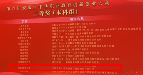 11月15日至16日,第六届安徽省中华职业教育创新创业大赛决赛在安徽滁州技师学院顺利举行。我校学生团队在此项比赛中首创佳绩,化学化工学院2023级化学专业范玥玥学生团队(指导老师:钱尼娜、朱凤)的项目《光驭形变:液晶弹性体智能响应包装材料》获省级本科组二等奖。