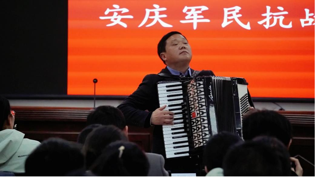 活动尾声,彭传山赏析了《游击队之歌》与《中国军魂》两首作品,将“没有枪,没有炮,敌人给我们造”的机智乐观,与新四军第四支队在安庆敌后战场神出鬼没的伏击战例相结合;将“亮剑精神”与程雄等烈士血战敌人的英雄气概相呼应。在铿锵旋律的回响中,历史场景与音乐情感交织,让在场师生深刻感受到中华民族百折不挠的坚韧品格与炽热的爱国情怀。