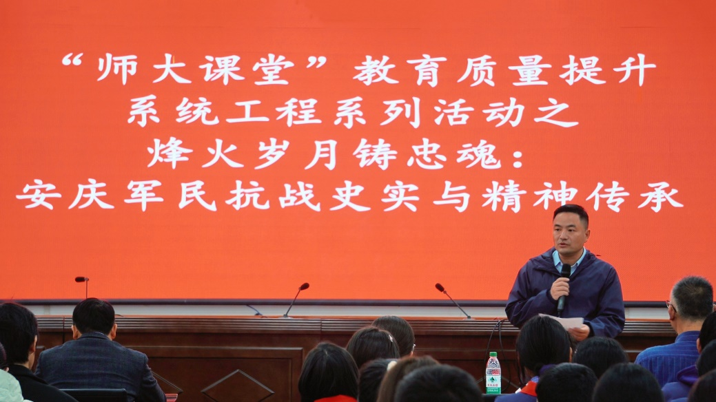 为深入推进“师大课堂”教育质量提升工程,进一步增强援疆支教队员与边疆学子的家国情怀,铸牢中华民族共同体意识,11月28日,我校第二批援疆支教志愿服务队在皮山县安徽实验学校成功举办“师大”课堂教育质量提升系统工程第二场活动——“烽火岁月铸忠魂:安庆军民抗战史实与精神传承”主题宣讲。支教队队长、我校研究生院副院长周毅,安徽实验学校第一校长孙金乙参加活动,支教队员与皮山县安徽实验学校八、九年级200余名师生代表参与。活动由周毅和支教队员、2024级学科教学(语文)专业陈兴馨主持。