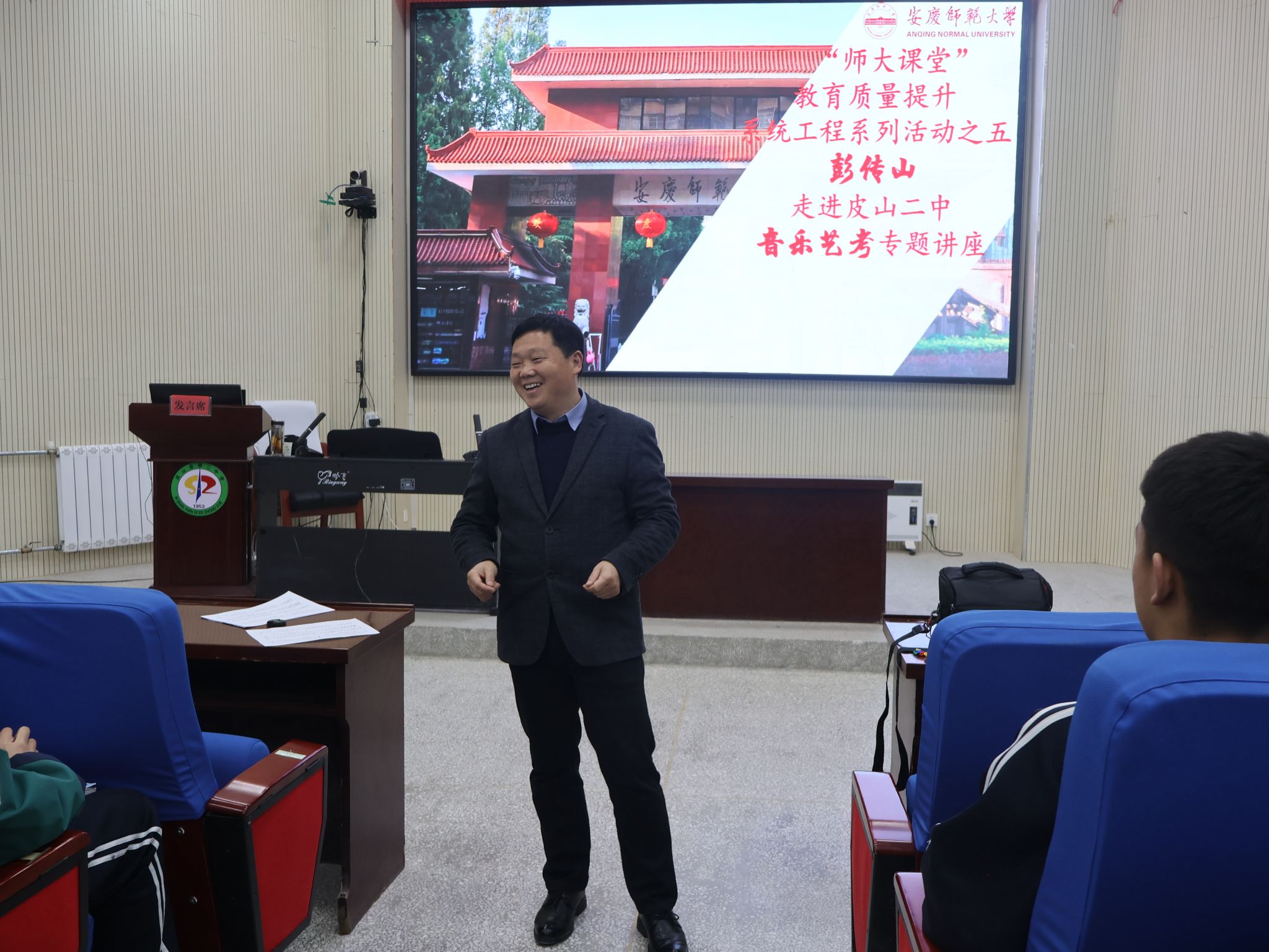 12月10日,学校第二批援疆支教志愿服务队推出的“师大课堂”教育质量提升系统工程第五期活动,在皮山县第二中学顺利开展。本期讲座特邀援疆支教志愿服务队指导老师、音乐学院副院长彭传山,为皮山县第二中学音乐艺术班学生作题为《音乐艺考乐理听写视唱的内容与方法》的专题讲座,该校高一、高二全体音乐艺考生及音乐教研组教师近百人参加。讲座由皮山县初中音乐教研员、县音乐名师工作室成员、皮山县第二中学音乐美术教研组组长陶丽娟老师主持。