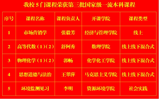 近日,教育部发布《关于公布第三批国家级一流本科课程认定结果的通知》,我校5门课程成功获批第三批国家级一流本科课程,涵盖线上、线上线下混合式、社会实践三类课程类型。截至目前,学校在三批国家级一流本科课程认定中累计获批 11门,实现五大类型全覆盖,课程建设成效显著。