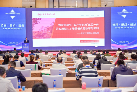 会上,潘锦云教授作了题为《微专业牵引“政产学研用”五位一体的应用型人才培养模式的改革与实践——以安庆师范大学为例》的主题报告。他系统阐述了我校以微专业为牵引,通过整合各方资源,构建协同育人机制的创新路径。他指出,微专业以其灵活性和针对性,有效衔接产业动态与人才培养,缩短了学生能力与市场需求的差距,为高等教育教学改革提供了可复制、可推广的实践范本。